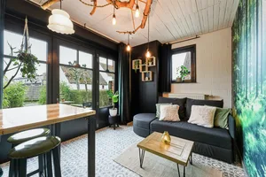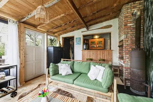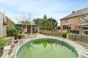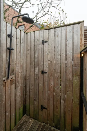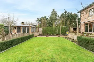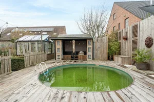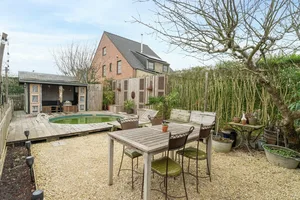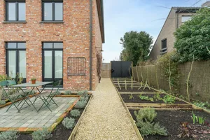 Langs de rechter zijgevel wandel je voorbij de moestuin en kom je achteraan terecht in een oase van rust. De tuin is opgedeeld in verschillende compartimenten en nodigt uit om te blijven ontdekken. Er is een kruidenkeuken, een mooie serre, meerdere terrassen en een gezellig houten bijgebouw met kitchenette en gemetste barbecue. Doorheen de tuin vind je bovendien tal van fruitbomen en struiken, waaronder kerselaars, appelbomen, een perelaar en meer.