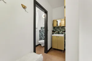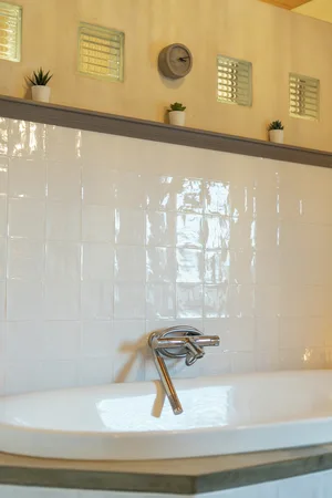 In de woning bevindt zich een afzonderlijke studio met eigen douchekamer (douche, lavabo en toilet), kitchenette, kleine zitruimte en aparte toegang. Deze ruimte is net zoals de woning heel smaakvol ingericht, een eyecatcher zijn de mooie tegeltjes in de badkamer.